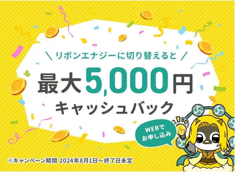 WEB申込み限定、今ならリボンエナジーへの切替えで最大5,000円キャッシュバック!