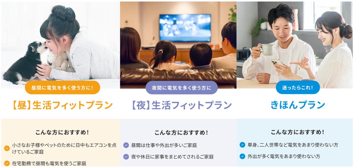 電気をよく使う時間帯に合わせた3つのプランを用意!日中ずっと家にいる人も、夜しか家にいない人も生活スタイルに合わせてお得に。複雑な料金単価を気にする必要ナシ・わかりやすい!