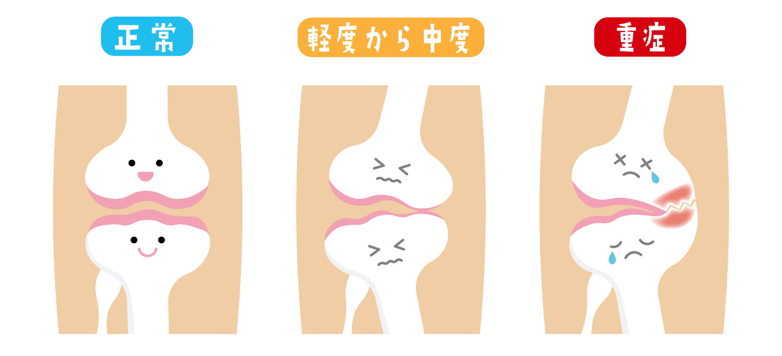主な原因は「軟骨の老化」で、軟骨がすり減ることです。関節が直接触れ合うようになり痛みが出ます。
