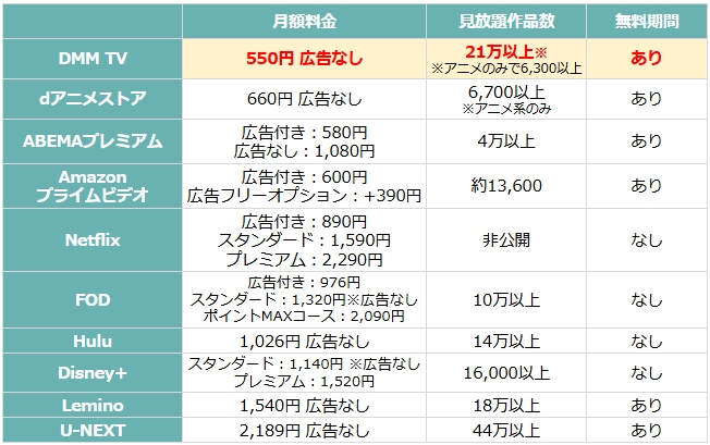 一方でDMM TVは見放題作品数が多く、広告もないため、コスパは動画配信サービスの中でも圧倒的。